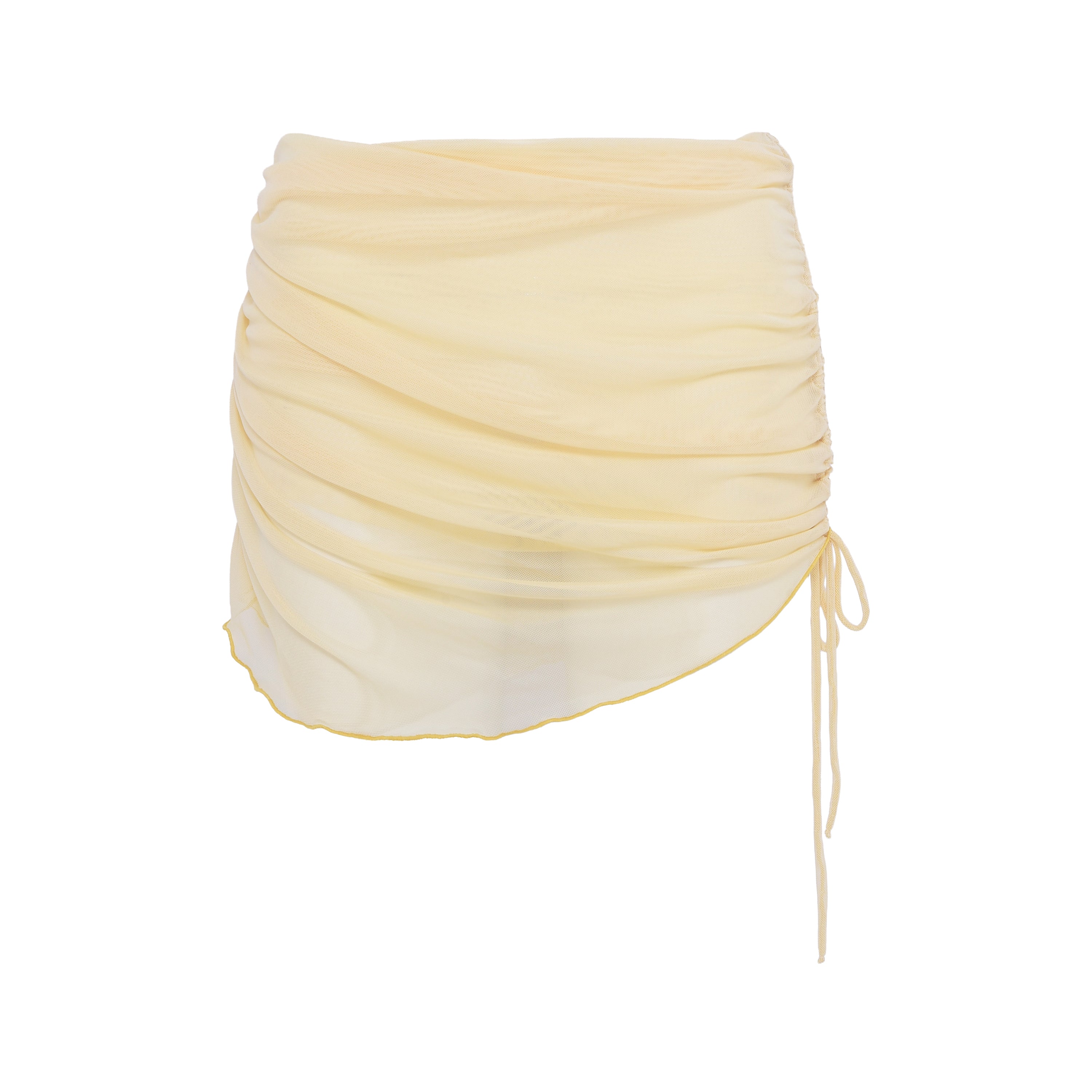 Saia tule franzida amarelo manteiga com cordinha na lateral para ajuste.